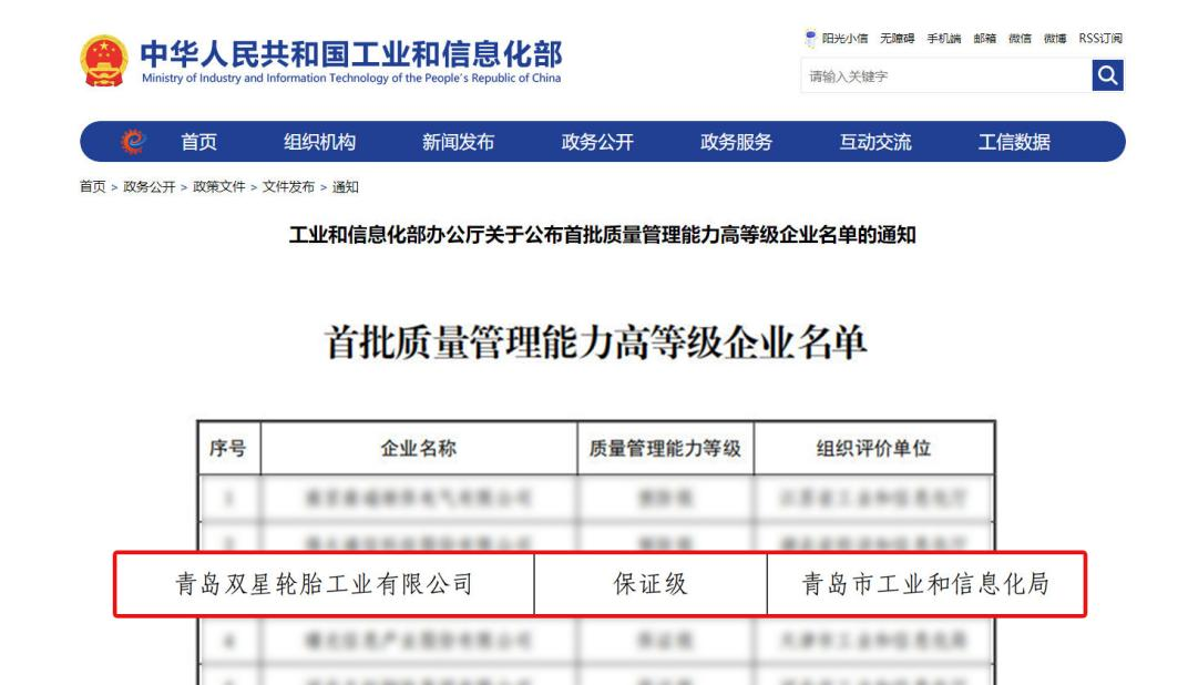 • 行業唯一!雙星輪胎入選工信部質量管理能力高等級企業名單